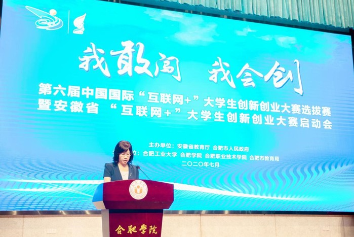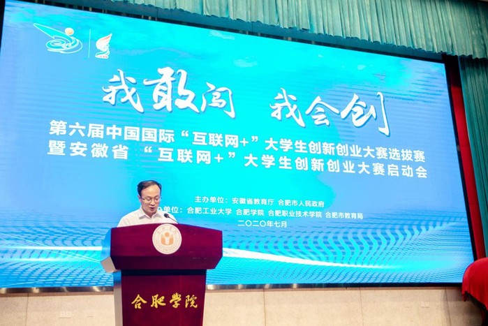 本届大赛以“我敢闯,我会创”为主题,由安徽省教育厅与合肥市人民政府联合主办,合肥工业大学、合肥学院、合肥职业技术学院、合肥市教育局共同承办。省教育厅副厅长储常连、合肥市人民政府副秘书长吴昌文、合肥学院党委书记王其东、合肥工业大学党委副书记陈刚、合肥职业技术学院党委书记罗兆好、合肥市教育局二级调研员唐文水出席启动会,会议由我校校长吴春梅主持。
