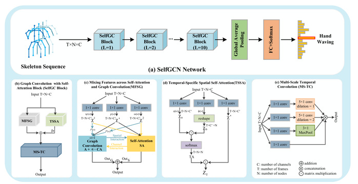 为此,研究团队提出了SelfGCN模型,该方法基于图卷积网络构建人体骨架的拓扑结构,并引入自注意力机制,以自适应地调整关节节点的重要性权重,从而更精准地捕捉动作特征。这一研究工作为基于图结构数据的人体动作识别提供了新的思路,有助于进一步理解和优化人体运动特征的建模方法。
