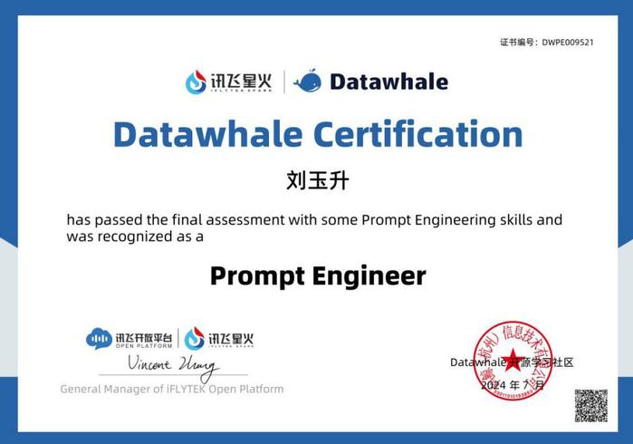 2024年6月至9月,在导师推荐下,刘玉升通过选拔进入科大讯飞股份有限公司讯飞数码研究院实习,深度参与了讯飞星火大模型的研发工作,主要负责Prompt工程优化任务。凭借扎实的专业基础和出色的工程能力,他系统性地完成了各类任务的整编工作,通过深入分析客户需求,制定了差异化的Prompt优化策略。在数据处理层面,他运用Python对训练数据进行清洗与统计分析,成功构建了包含10万余条的高质量SFT数据,覆盖33个具体任务场景。此外,他还参与了大模型效果的评测工作,为后续模型的迭代优化提供了支持。