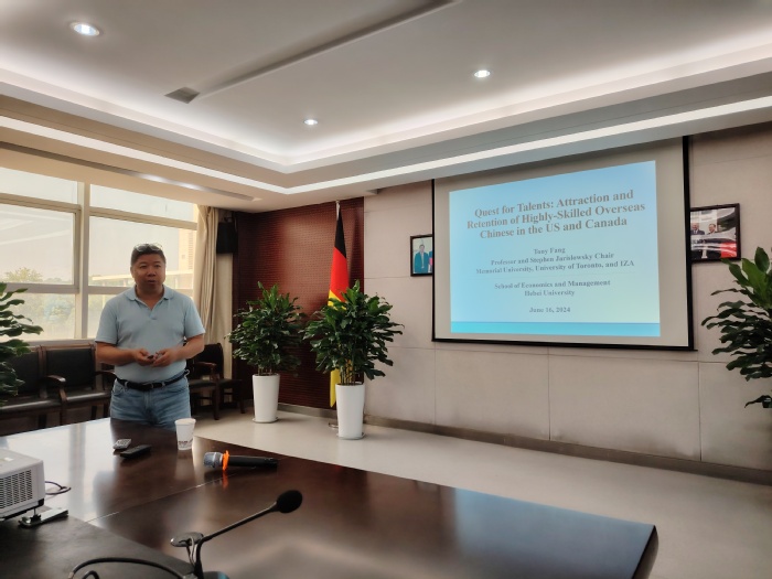 方涛教授以“Attraction and retention of highly skilled overseas Chinese in the United States and Canada”(《美国和加拿大对海外华人高端人才的吸引与留用研究》)为题给经济与管理学院师生做了一场精彩的学术报告。他结合丰富的研究数据与案例,深入剖析美加两国吸引和留住海外华人高技能人才的策略。报告结束后,方涛与经济与管理学院师生、德籍教授汤卫思进行座谈,就国际人才流动趋势、区域经济发展与人才政策等议题展开讨论,碰撞出诸多思想火花。