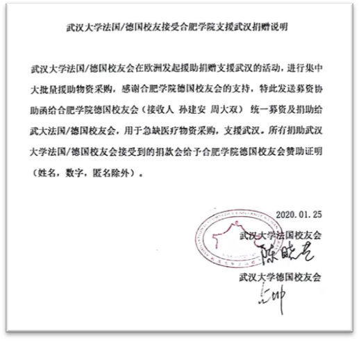 “留德校友是一家,奉献不分你我他”。德国校友会在主席周大双的带领下,积极寻求到更快捷的捐献通道——武汉大学留德校友会,连同武汉大学留法校友会并携手众多在欧华人组织,积极募捐。时间就是生命,合肥学院校友们在不到三天的时间里,就筹得第一批善款超过万元。面对国内抗击病毒医用物资短缺的现实情况,合肥学院德国校友会利用其会员分布行业领域广泛的优势和资源,协助武汉大学校友会将各渠道汇总的善款在德国第一时间采购了医用口罩、护目镜及防护服等国内急缺医用物资,同时协助打通了最快捷的通往武汉的物流渠道。第一批物资已经于2月2日悉数运抵武汉抗击病毒最前线——武汉大学人民医院和中南医院。目前,德国校友会筹得的第二批善款也正在对接中。因为之前采购及物流通道都已打通,第二批物资也会在近日以最快的速度发往武汉。