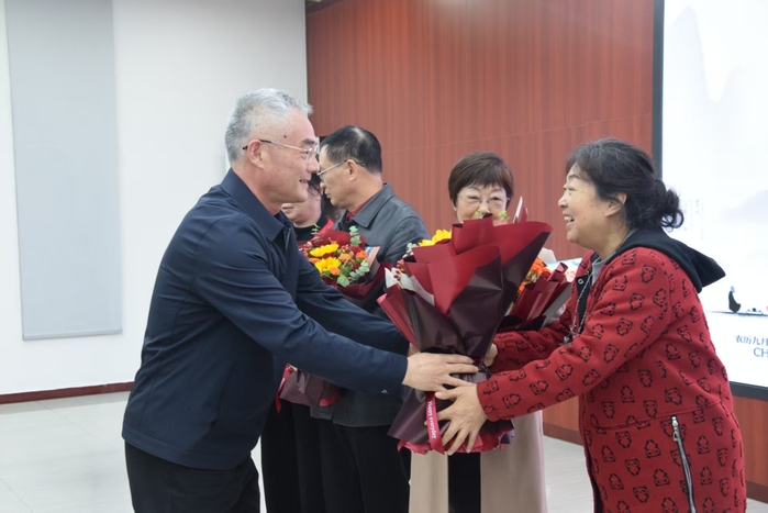 在集体祝寿环节,校领导为9位整寿老同志献上鲜花和贺卡,大家合影留念,现场气氛温馨热烈。