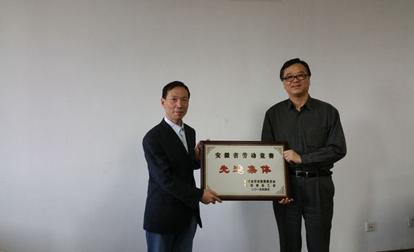 5月12日下午,合肥市总工会副主席戴建军,经济技术部部长孟卫民,文教工会主席颜慧珍等来我校颁授 “安徽省劳动竞赛先进集体”牌匾,并为我校“劳模(职工)创新工作室”揭牌。校党委书记蔡敬民会见了市总工会领导。副书记丁明,工会主席崔国庆等在行政楼四楼会议室热情接待了来宾。