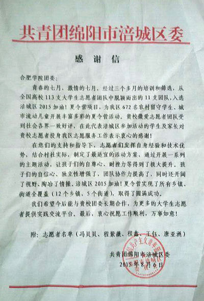 今年,来自全国113支高校志愿者团队报名参加本次2015加油乡村夏令营活动,合肥学院“微爱”团队以全国第二的名次获得项目执行资格并在七月初奔赴四川绵阳参加社会志愿活动,参加了西南科技大学的五天成长营培训在绵阳丰谷镇致富村、廻龙沟的两期夏令营营会。据悉,共青团绵阳市涪城区委在给合肥学院团委的感谢信中写道:贵校微爱志愿者团队受到社会各界一致好评,希望今后能与贵校团委长期合作,为更多的大学生志愿者提供实践交流平台。