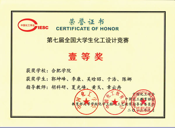 在2013年举办的“中国石化——三井化学杯”第七届全国大学生化工设计大赛中,化工工程师之家的五个参赛团队代表我校参赛,分别荣获1个全国一等奖、1个全国二等奖和3个全国三等奖。其中,“FK—团队”作为安徽高校唯一进入全国总决赛的团队,由郭坤峰、李康、吴晗昭、于浩、陈娜五位来自不同专业与年级的学生组成。他们在化学与材料工程系老师胡科研、夏光辉、黄戈、章云冉的悉心指导下,凭借着“年产20万吨丁辛醇”这一项目,在竞赛中过五关,斩六将,最终在全国160多所高校1000多支队伍中脱颖而出,荣获全国一等奖。