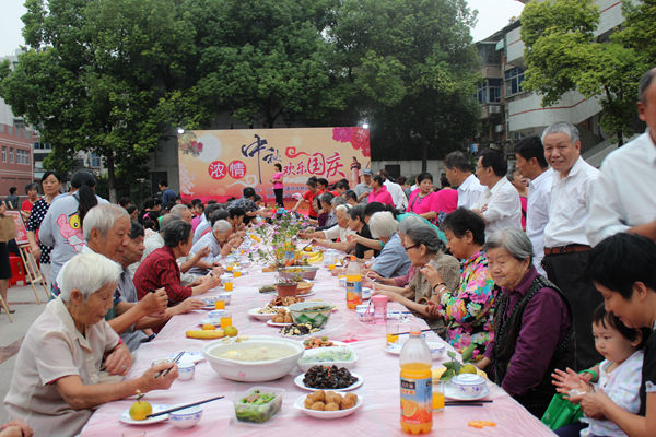 下午5文艺表演在合肥市南门小学正式上演,社区居民与合肥学院大学生们欢聚一堂,载歌载舞。由社区退休老人组建的夕阳红合唱队带来的歌曲合唱,黄梅戏、京剧、葫芦丝等节目表演异彩纷呈,引得观众阵阵喝彩。韩国留学生们用中文倾情演唱的《月亮代表我的心》与用韩语演唱的《去旅游》把现场氛围推向高潮,居民随着歌声打着节拍,其乐融融。活动现场,社区几十位孤寡老人围坐一起,在欣赏文艺节目的同时享受着社区居民和辖区餐饮企业精心准备的百家饭,在感受节目带来的快乐的同时,也体会到了廻龙桥这个大家庭的温馨与温暖。