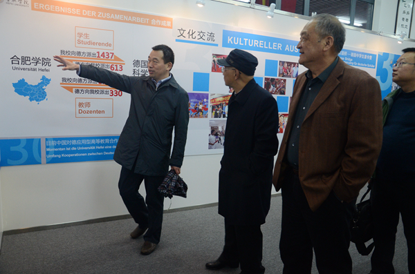 会前,国家教育咨询委员会调研组在张文兵等陪同下参观我校中德合作共建30周年成果展。