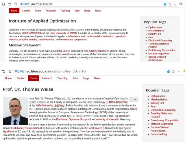 汤卫思(Tomas Weise)教授,于德国完成博士学业后,先后七年在中国高校完成博士后及副教授岗位工作,在计算机数据处理及方案优化领域,研究能力强劲,先后在国际知名权威学术杂志发表多篇具有影响力的文章,并参与和执行有多项中国国家自然科学基金等项目。汤卫思教授目前被引进我校,于我校计算机科学与技术系牵头成立应用优化研究所(IAO,迅速开展启动多项研究工作。此外,他还利用个人学术领域影响力,广泛宣传我校中德教育合作示范基地,为我校引进更多国际化高层次人才。