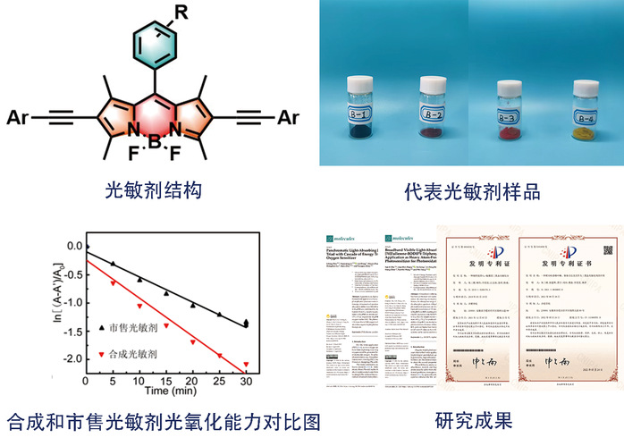 三重态光敏剂在光伏电池、光动力学疗法等领域具有广泛的应用,是实现国家“十四五”亟待解决的难题“腔内肿瘤高效靶向光动力治疗方法”的核心。该项目针对传统光敏剂的缺点和发展新型光敏剂的瓶颈问题,提出利用化学合成手段,调整氟硼荧的共轭结构以及引入自旋转换单元,合成了系列具有稳定系间窜越能力、在可见-近红外光区具有较强光捕获能力、较长三重激发态寿命和较高单线态氧量子产率的光敏剂。基于此项目,共获授权发明专利2项、发表SCI收录论文2篇、签订企业委托研发项目1项。